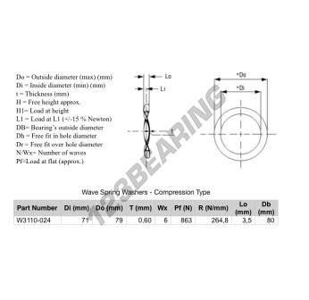 The Wave Spring Washers- Compression Type with the reference W3110024 has an inner diameter of 71 mm, an outer diameter of 79 mm and a thickness of 0.6 mm. It is made of STEEL.