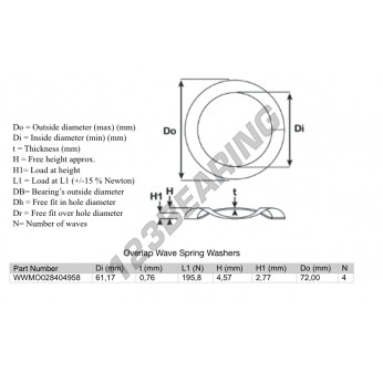 The Overlap Wave Spring Washer with the reference OWSW-72-61.17-0.76-4 has an inner diameter of 61.17 mm and a thickness of 0.76 mm. It is made of STEEL.