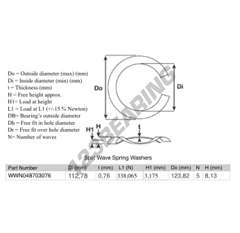 The Split Wave Spring Washer with the reference SWSW-123.82-112.78-0.76-5 has an inner diameter of 112.78 mm and a thickness of 0.76 mm. It is made of STEEL.