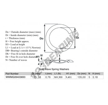 The Split Wave Spring Washer with the reference SWSW-135-121.38-0.76-5 has an inner diameter of 121.38 mm and a thickness of 0.76 mm. It is made of STEEL.