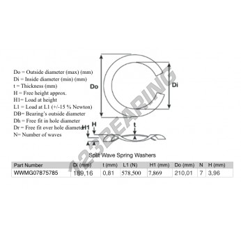The Split Wave Spring Washer with the reference SWSW-210.01-189.16-0.81-7 has an inner diameter of 189.16 mm and a thickness of 0.81 mm. It is made of STEEL.