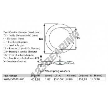 The Split Wave Spring Washer with the reference SWSW-459.99-432.82-1.07-11 has an inner diameter of 432.82 mm and a thickness of 1.07 mm. It is made of STEEL.