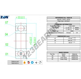 The Deep Groove Ball Bearing, known as 16034-M-ZEN ZEN, has an inner diameter of 170 mm, an outer diameter of 260 mm and a thickness of 28 mm.