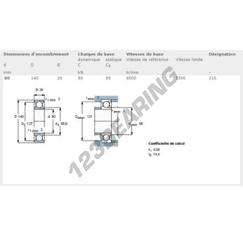 The Deep Groove Ball Bearing, known as 216-SKF from the brand SKF, has an inner diameter of 80 mm, an outer diameter of 140 mm and a thickness of 26 mm.