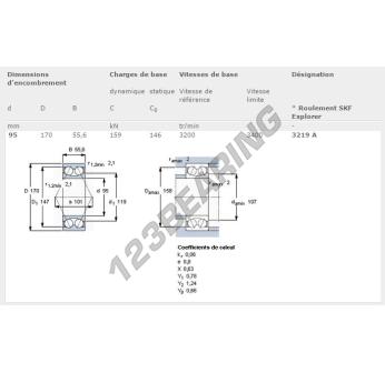 The Deep Groove Ball Bearing, known as 3219-A-SKF SKF, has an inner diameter of 95 mm, an outer diameter of 170 mm and a thickness of 55.6 mm.