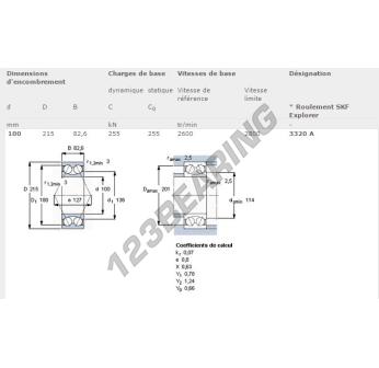 The Deep Groove Ball Bearing, known as 3320-A-SKF from the brand SKF, has an inner diameter of 100 mm, an outer diameter of 215 mm and a thickness of 82.6 mm.