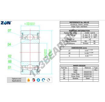 The Deep Groove Ball Bearing, known as 605-2Z-ZEN ZEN, has an inner diameter of 5 mm, an outer diameter of 14 mm and a thickness of 5 mm.