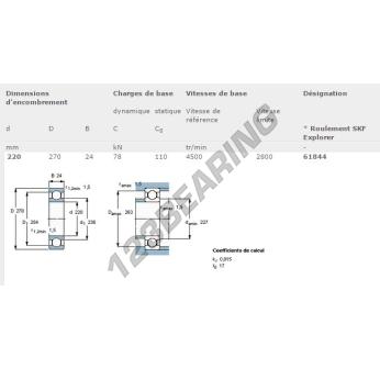 The Deep Groove Ball Bearing, known as 61844-SKF from the brand SKF, has an inner diameter of 220 mm, an outer diameter of 270 mm and a thickness of 24 mm.