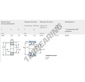 The Deep Groove Ball Bearing, known as 6321-SKF SKF, has an inner diameter of 105 mm, an outer diameter of 225 mm and a thickness of 49 mm.