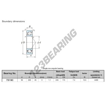 The Deep Groove Ball Bearing, known as 7319-C-JTEKT JTEKT, has an inner diameter of 95 mm, an outer diameter of 200 mm and a thickness of 45 mm.