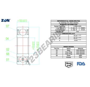 The Deep Groove Ball Bearing, known as S6209-2RS-FDA-AISI420-ZEN ZEN, has an inner diameter of 45 mm, an outer diameter of 85 mm and a thickness of 19 mm.