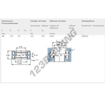 The Thrust Ball Bearing, known as 52311-SKF SKF, has an inner diameter of 45 mm, an outer diameter of 105 mm and a thickness of 64 mm.