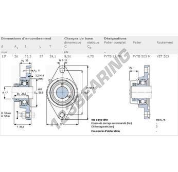 The Housed Bearing - 2 Bolts known as FYTB17-FM-SKF SKF has a shaft diameter of 17 mm and a fixing spacing of 76.5 mm. This part number is produced in cast iron and the tightening type is .