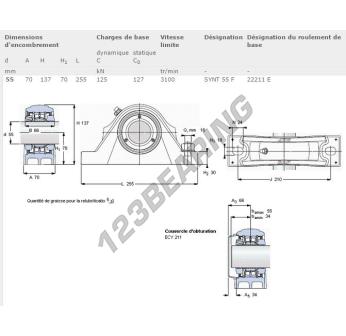 The Housed Bearing - 2 Bolts known as SYNT55F-SKF SKF has a shaft diameter of 0 mm and a fixing spacing of mm. This part number is produced in cast iron and the tightening type is .