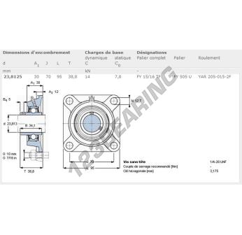 The Housed Bearing - 4 Bolts known as FY15-16-TF-SKF SKF has a shaft diameter of 23.81 mm and a fixing spacing of 70 mm. This part number is produced in cast iron and the tightening type is .