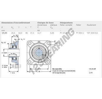 The Housed Bearing - 4 Bolts known as FY3-4-RM-SKF SKF has a shaft diameter of 19.05 mm and a fixing spacing of 63.5 mm. This part number is produced in cast iron and the tightening type is .