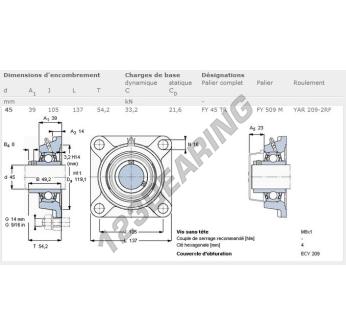 The Housed Bearing - 4 Bolts known as FY45-TR-SKF SKF has a shaft diameter of 45 mm and a fixing spacing of 105 mm. This part number is produced in cast iron and the tightening type is .