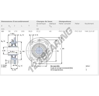 The Housed Bearing - 4 Bolts known as FYC65-TF-SKF SKF has a shaft diameter of 65 mm and a fixing spacing of 120.2 mm. This part number is produced in cast iron and the tightening type is .