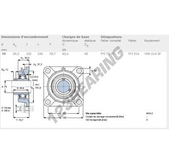 The Housed Bearing - 4 Bolts known as FYJ70-TF-SKF SKF has a shaft diameter of 70 mm and a fixing spacing of 152 mm. This part number is produced in cast iron and the tightening type is .