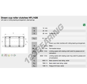 The Drawn Cup Roller Clutches, known as HFL1426-L564-INA INA, has an inner diameter of 14 mm, an outer diameter of 20 mm and a thickness of 26 mm.