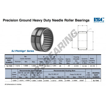 The Drawn Cup Needle Roller Bearing, known as SJ7345-RBC RBC, has an inner diameter of 49.2125 mm, an outer diameter of 63.5 mm and a thickness of 31.75 mm.
