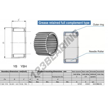 The Drawn Cup Needle Roller Bearing, known as YB1112-IKO IKO, has an inner diameter of 12.462 mm, an outer diameter of 22.225 mm and a thickness of 19.05 mm.