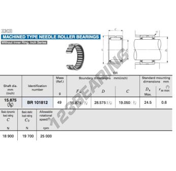 The Needle Roller Bearing, known as BR101812-IKO IKO, has an inner diameter of 15.875 mm, an outer diameter of 28.575 mm and a thickness of 19.05 mm.