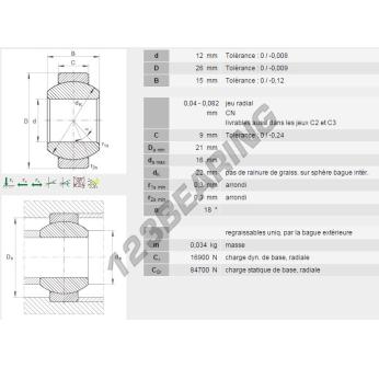 The Rod End Ge known as GE12-FO-INA INA has an inside diameter of 12 mm, an outside diameter of 26 mm and a thickness of 15 mm.