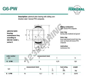 The Rod End Geew known as G6-PW-DURBAL DURBAL has an inside diameter of 6 mm, an outside diameter of 16 mm and a thickness of 6.75 mm.
