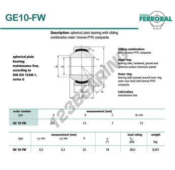 The Rod End Geew known as GE10-FW-DURBAL DURBAL has an inside diameter of 10 mm, an outside diameter of 22 mm and a thickness of 7 mm.