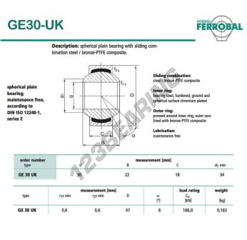 The Rod End Geew known as GE30-UK-DURBAL DURBAL has an inside diameter of 30 mm, an outside diameter of 47 mm and a thickness of 18 mm.
