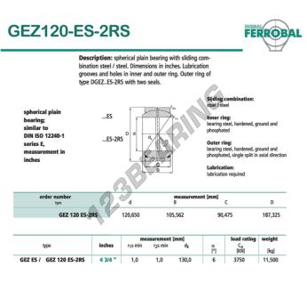 The Rod End Geew known as GEZ120-ES-2RS-DURBAL DURBAL has an inside diameter of 120.65 mm, an outside diameter of 187.325 mm and a thickness of 90.475 mm.