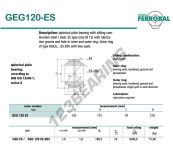 The Rod End Geg known as GEG120-ES-DURBAL DURBAL has an inside diameter of 120 mm, an outside diameter of 210 mm and a thickness of 70 mm.