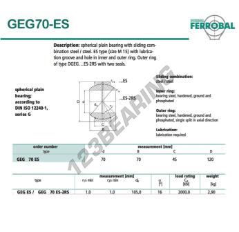 The Rod End Geg known as GEG70-ES-DURBAL DURBAL has an inside diameter of 70 mm, an outside diameter of 120 mm and a thickness of 45 mm.