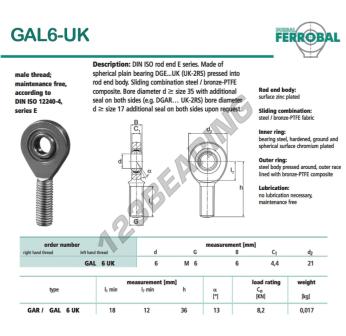 The Rod End Sa known as DGAL6-UK-DURBAL DURBAL has a screw thread of , an inner diameter of 6 mm, an outer diameter of 21 mm and a thickness of 6 mm.