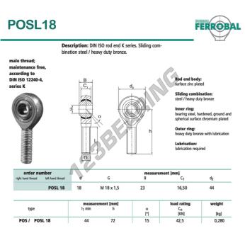 The Rod End Sa known as DPOSL18-DURBAL DURBAL has a screw thread of , an inner diameter of 18 mm, an outer diameter of 44 mm and a thickness of 23 mm.
