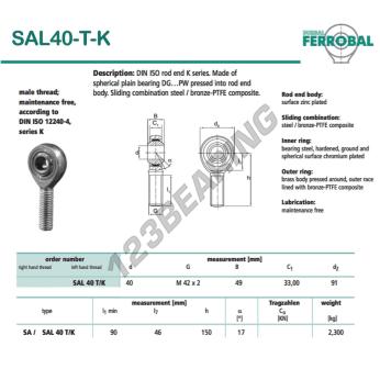 The Rod End Sa known as SAL40-T-K-DURBAL DURBAL has a screw thread of , an inner diameter of 40 mm, an outer diameter of 91 mm and a thickness of 49 mm.