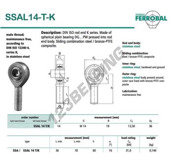 The Rod End Sa known as SSAL14-T-K-DURBAL DURBAL has a screw thread of , an inner diameter of 14 mm, an outer diameter of 36 mm and a thickness of 19 mm.