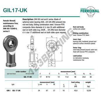 The Rod End Si known as GIL17-UK-DURBAL DURBAL has an inside diameter of 17 mm, an outside diameter of 46 mm and a thickness of 14 mm.
