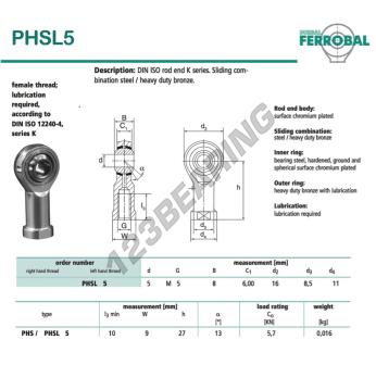 The Rod End Si known as PHSL5-DURBAL DURBAL has an inside diameter of 5 mm, an outside diameter of 16 mm and a thickness of 8 mm.