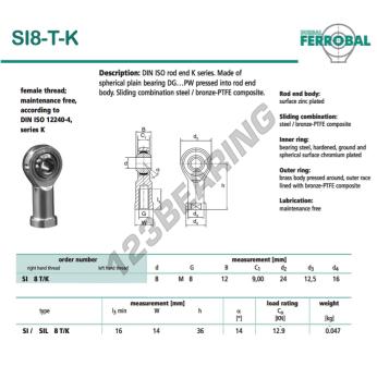 The Rod End Si known as SI8-T-K-DURBAL DURBAL has an inside diameter of 8 mm, an outside diameter of 24 mm and a thickness of 12 mm.