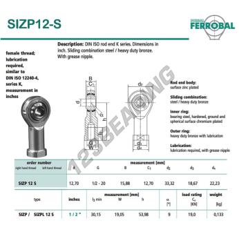 The Rod End Si known as SIZP12-S-DURBAL DURBAL has an inside diameter of 12.7 mm, an outside diameter of 33.32 mm and a thickness of 15.88 mm.