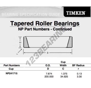 The Raw Cup, known as NP241715-TIMKEN TIMKEN, has an inner diameter of mm, an outer diameter of 200 mm and a thickness of 34.925 mm.