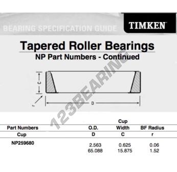 The Raw Cup, known as NP259680-TIMKEN TIMKEN, has an inner diameter of mm, an outer diameter of 65.088 mm and a thickness of 15.875 mm.