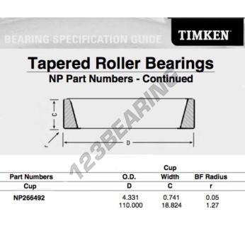 The Raw Cup, known as NP266492-TIMKEN TIMKEN, has an inner diameter of mm, an outer diameter of 110 mm and a thickness of 18.824 mm.