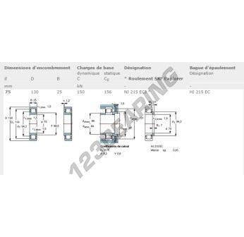 The Roller Bearing, known as NJ215-ECJ-SKF SKF, has an inner diameter of 75 mm, an outer diameter of 130 mm and a thickness of 25 mm.