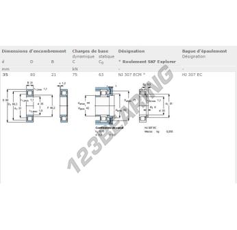 The Roller Bearing, known as NJ307-ECM-SKF SKF, has an inner diameter of 35 mm, an outer diameter of 80 mm and a thickness of 21 mm.