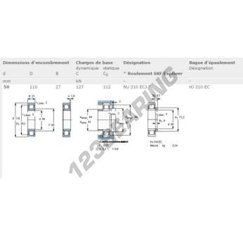 The Roller Bearing, known as NU310-ECJ-SKF SKF, has an inner diameter of 50 mm, an outer diameter of 110 mm and a thickness of 27 mm.