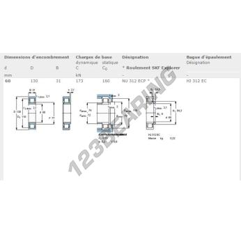 The Roller Bearing, known as NU312-ECP-SKF SKF, has an inner diameter of 60 mm, an outer diameter of 130 mm and a thickness of 31 mm.