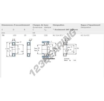 The Roller Bearing, known as NU314-ECJ-SKF SKF, has an inner diameter of 70 mm, an outer diameter of 150 mm and a thickness of 35 mm.